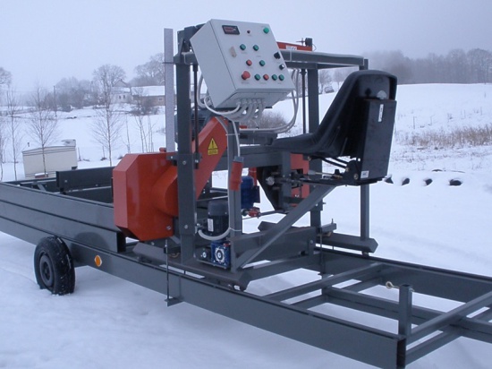 Trak taśmowy, przewożny. Długość torowiska 12 mb, posuw na falowniku, podnoszenie głowicy elektryczne, elektroniczny czytnik grubości cięcia, korowarka sterowana z pulpitu, napinacz piły hydrauliczny, fotel operatora.